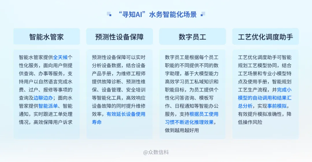 “尋知AI”智慧水務主要圍繞水務服務與管理中智能化落地痛點,聚焦智能水管家、預測性設(shè)備保障、數(shù)字員工、工藝優(yōu)化調(diào)度助手四大板塊智能體研發(fā)。